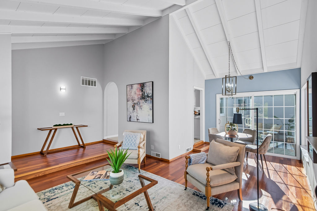 Open-concept kitchen boasts newly-redone pantry, stainless steel appliances with five-burner gas stove, and long peninsula with seating. Soaring vaulted ceilings and exposed beams create airy living room and continue into the bedrooms. Spacious primary suite includes walk-in-closet and generous en-suite bathroom with wraparound vanity counter and large soaking tub.